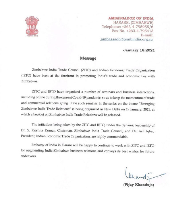 We are committed to establish Investment Opportunities and Trade Relations between Zimbabwe & India.